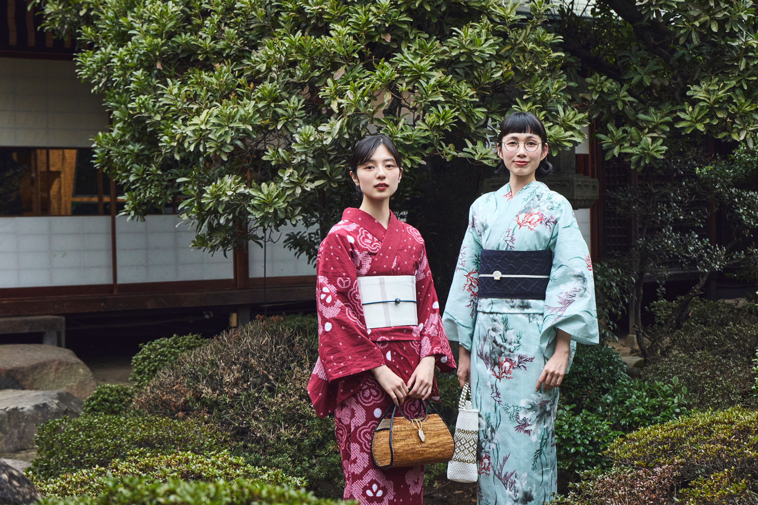 〈左〉ゆかた | 絞りゆかた 小梅尽くし 真紅 79,200円(ゆかた仕立付), 帯 | 麻小袋帯 和紙横段 白×赤紫 16,500円(仕立上り品)〈右〉ゆかた | 珊瑚の森 薄荷色 マイサイズオーダー:33,000円 仕立上り品:30,800円, 帯 | 麻小袋帯 ふくれ菱 紺×ベージュ 16,500円(仕立上り品)